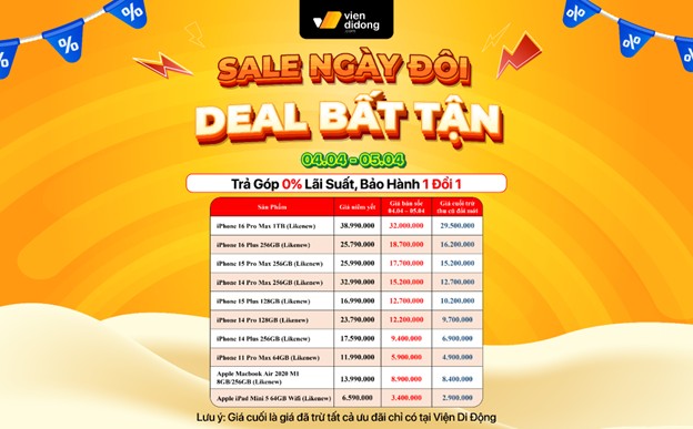 Ở dịp này, nhiều dòng iPhone cũ tại hệ thống Viện Di Động sẽ được điều chỉnh về mức giá cực tốt để người dùng tranh thủ nâng cấp thiết bị. Đơn cử, iPhone 16 Pro Max 1TB cũ có giá bán sốc chỉ 32 triệu đồng; iPhone 16 Plus cũ còn 18,7 triệu đồng; iPhone 15 Pro Max cũ còn 17,7 triệu đồng hay iPhone 14 Pro Max cũ cũng chỉ còn 15,2 triệu đồng… Ở phân khúc dễ tiếp cận hơn, iPhone 15 Plus cũ về giá 12,7 triệu đồng, iPhone 14 Pro cũ còn 12,2 triệu đồng đồng và iPhone 14 Plus cũ còn 9,4 triệu đồng.